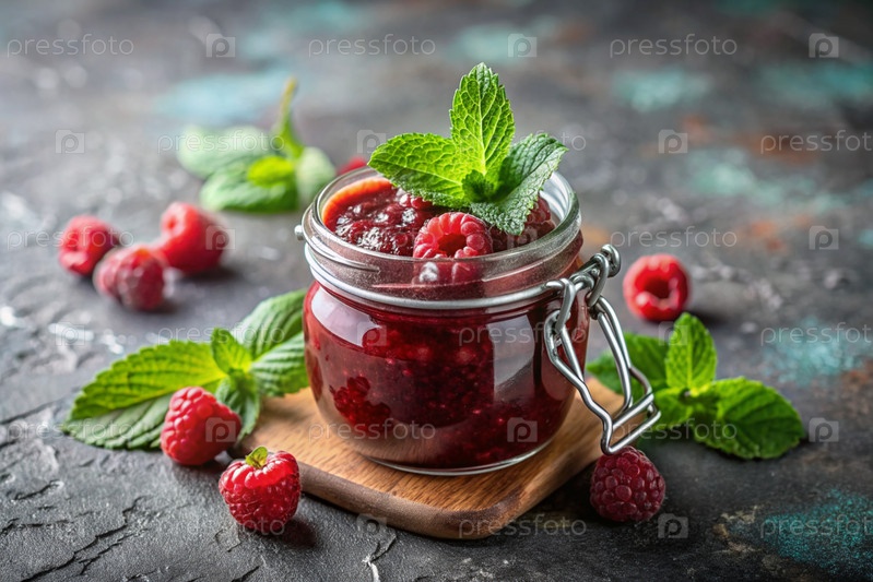 Банка домашней малины, здоровый варенье с мятой на черном фоне.Сохранение и уборка летом