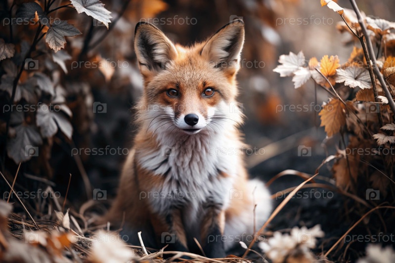 Красная лиса, сидящая среди осеннего листвы.Охота на животных
