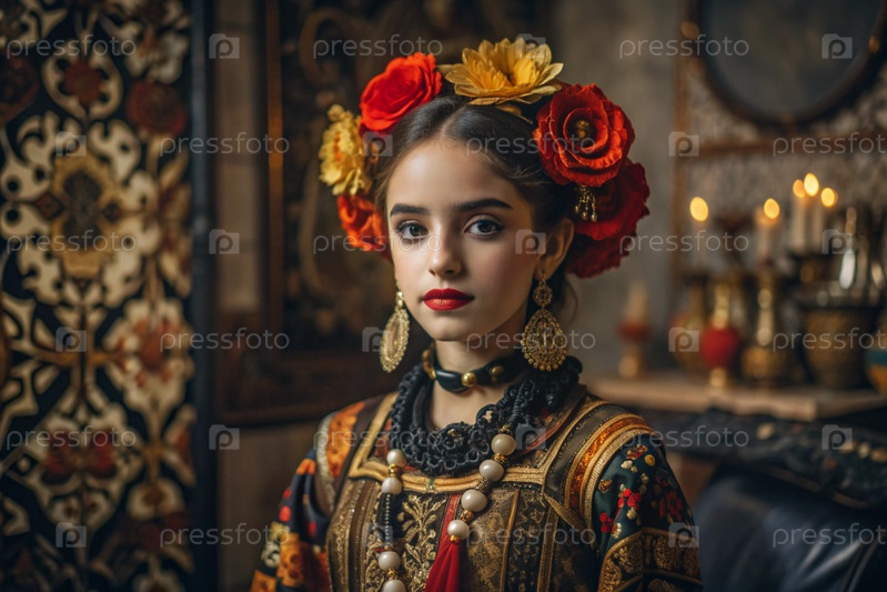 Испанская девушка в традиционном испанском национальном костюме. Перед быком. Бикоборство. Портрет символизирует традиции и культуру народа Испании