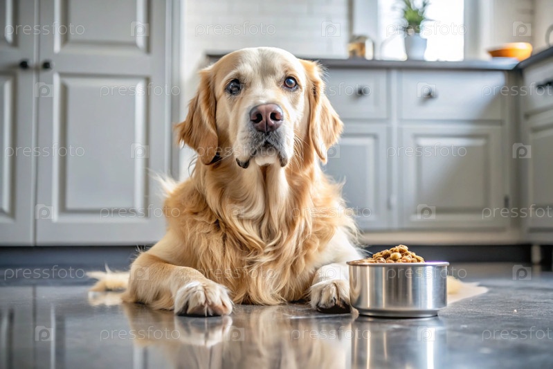 Милая собака золотого ретривера рядом с миской на белой кухне.Собака смотрит в камеру.Уход за животными