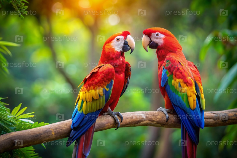 Два больших красных макак сидят на ветке на размытом тропическом фоне