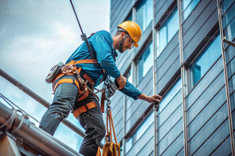 Мужчина-строитель в защитном снаряжении, ремнях безопасности и с крючками для ремней безопасности для работы на большой высоте