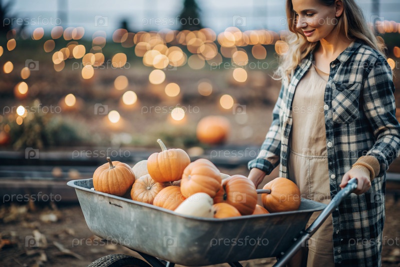 Руки женщины в квадратной рубашке с тыквенным крупным планом и красивым осенним рисунком. Сбор тыков. Концепция празднования Дня благодарения и Хэллоуина