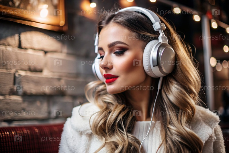 Молодая красивая гламурная девушка с большими наушниками и ярко-красной помадой, слушающая музыку на ушах