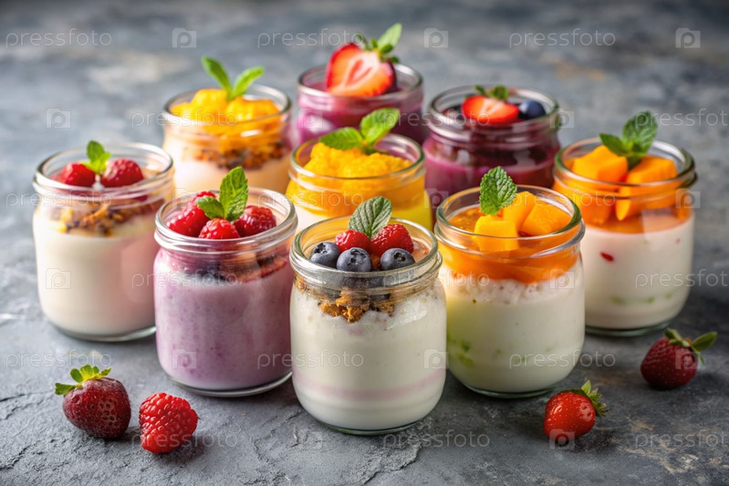 Разнообразный домашний йогурт с различными свежими ягодами и фруктами в стеклянных банках на стильном сером фоне