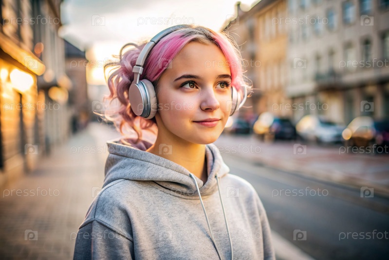 Молодая красивая кудрявая женщина с розовыми волосами слушает музыку на наушниках на вечерней улице города.Мир, гармония, отдых и расслабление