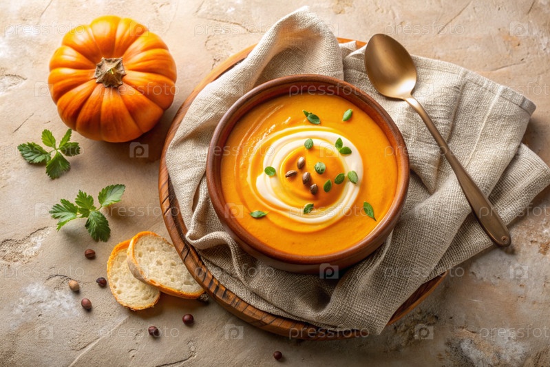 Традиционный мягкий тыквенно-кремовый суп с сливками и семьями тыквы на бежевом бетонном фоне