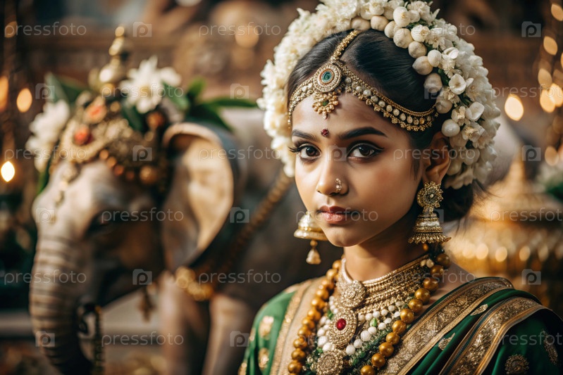 Красивая индийская девушка в традиционном национальном костюме, сари. со слонами. портрет символизирует традиции, культуру и красоту народа Индии