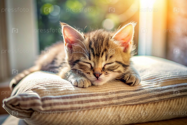 Милый котенок спит на подушке у окна.Кот удобно расположился в своем любимом месте, чтобы отдохнуть под солнцем