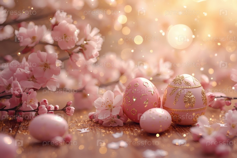 Концепция яркого пасхального праздника в 2026 году.Концепция ярких пасхальных праздников.Нежные розовые пасхальные яйца и вишневые ветви на деревянном фоне
