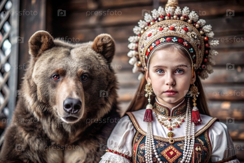 Красивая девушка в традиционном русском национальном костюме.Перед живым медведем.Портрет символизирует традиции и красоту русского народа