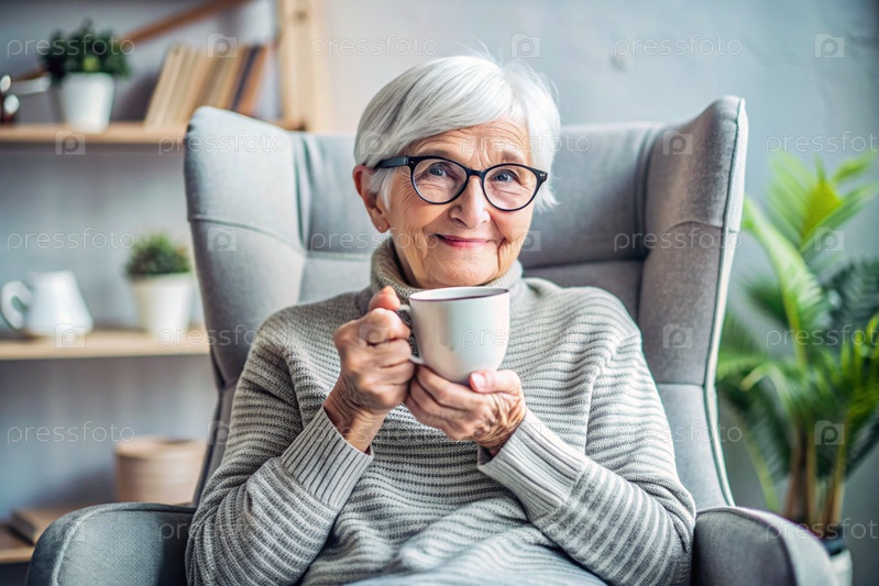 Пожилая пенсионерка, современная бабушка в очках, пьет кофе из кружки во внутренней части гостиной, сидя на стуле дома под естественным светом