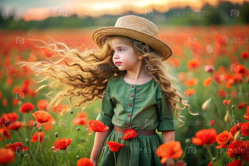 Портрет красивой кудрявой девушки в соломенной шляпе и платье на цветущем поле красного мака. Детство. Девочка позирует и смотрит в камеру