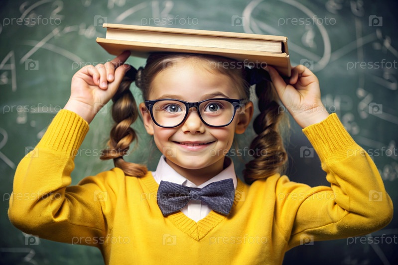 Красивая девушка с очками и книгами на голове. Ребенок впервые идет в школу. Ребёнок в классе со доской на заднем плане. Возвращение к школе
