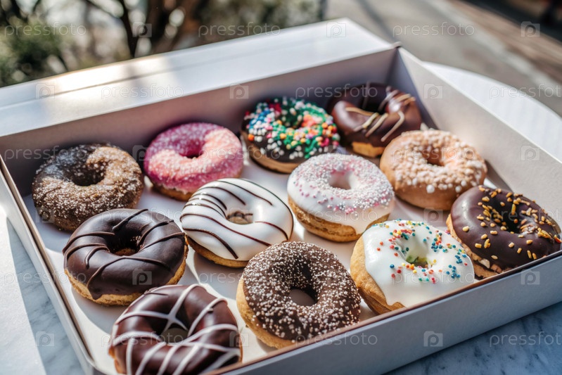 Вкусный десерт. больная коробка различных пончиков с красочными посыпаниями на столе. кондитерские изделия