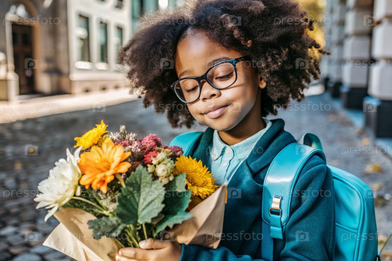 Красивая афроамериканка на очках с букетом осенних цветов впервые идет в школу. Ребенок со школьной сумкой, книгой и цветами. Малыш на городской улице