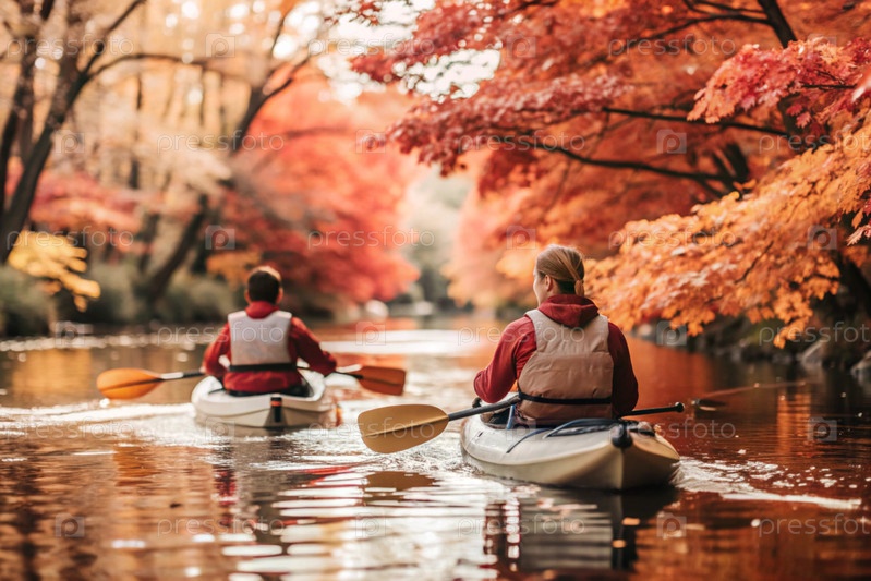 Каякисты с веслами в руках плывут по реке на фоне осеннего пейзажа
