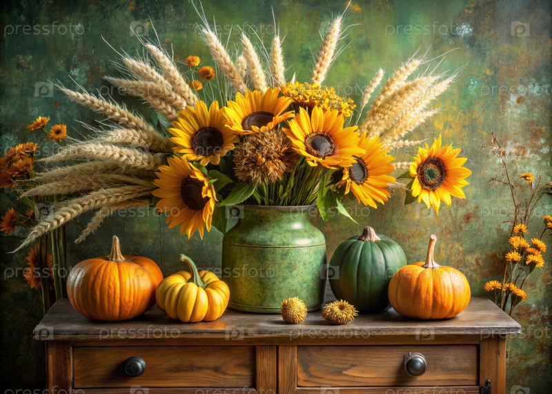Красивый осенний букет желтых подсолнечников и пшеницы в вазе и декоративные тыквы на древнем деревянном шкафу. Букет цветов в вазе во внутренней части дома. Желтый, зеленый цветочный фон