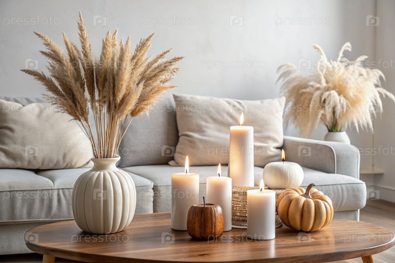 Современная белая керамическая ваза с сухой травой, свечами на деревянном столе и тыквами Скандинавский интерьер Концепция осеннего декора и комфорта в доме