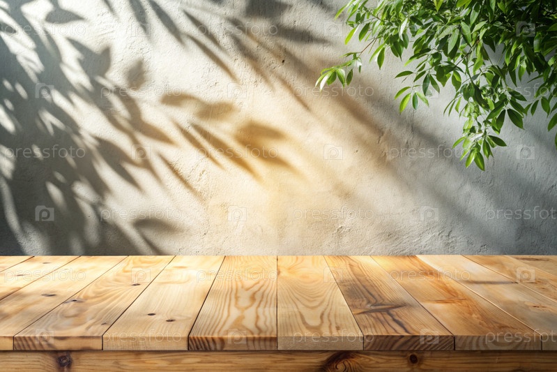 Пустая старая деревянная столешница на серой стене с солнечным светом и тенями от листьев деревьев