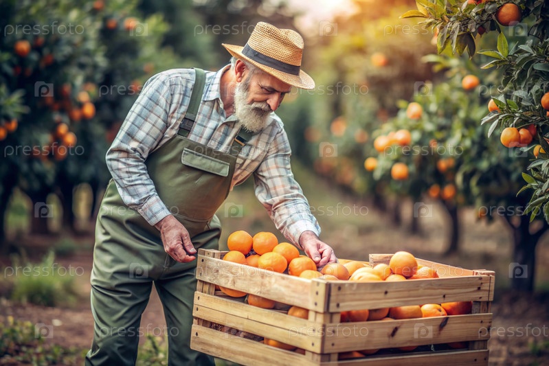 Сельскохозяйственная промышленность. Деревянный ящик с апельсинами в руках фермера-мужчины. Садовник собирает богатый урожай. Ближе, солнечный свет. Осенний сбор фруктов