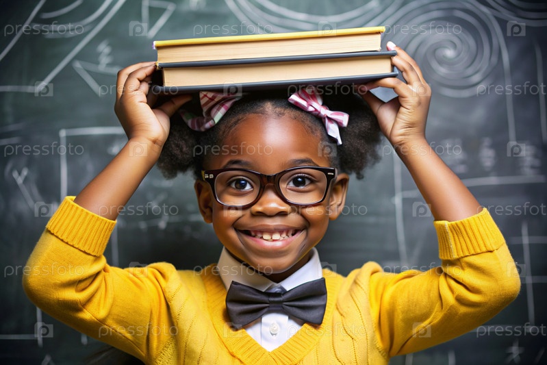 Красивая афроамериканская девушка с очками и книгами. Ребенок впервые ходит в школу. Ребёнок в классе с доской