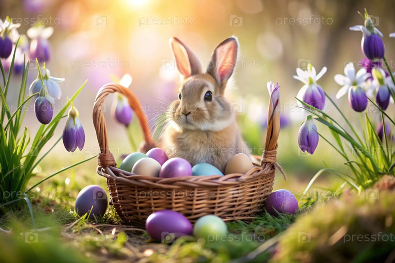 Баннер. пасхальный кролик в корзине из красочных пасхальных яиц вокруг весенних снегопадов и первичной розы. концепция праздника Пасхи