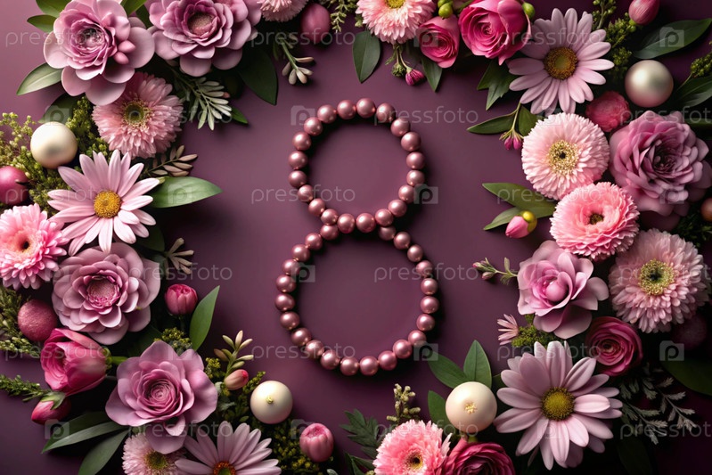 Международный женский день. баннер, флаер. праздничный цветочный фон в бургундских тонах с номером 8