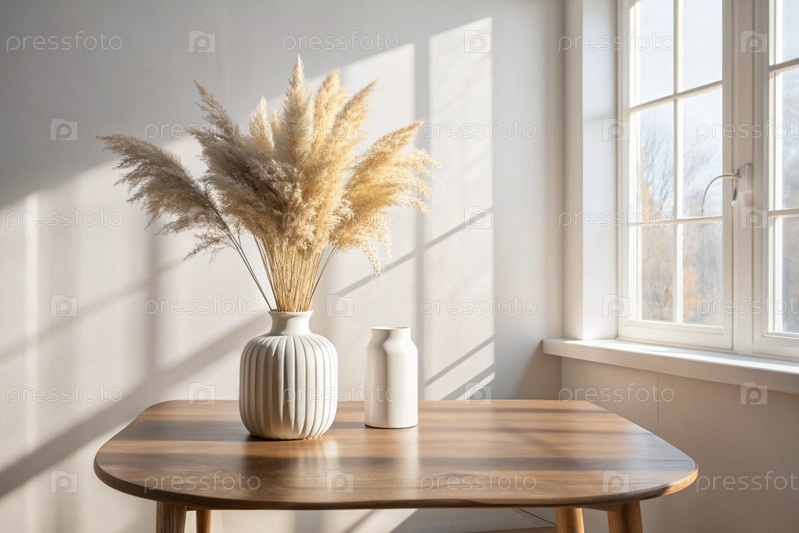 Современная белая керамическая ваза с сухой травой на деревянном столе Скандинавский интерьер Пустая белая стена со тенью из окна