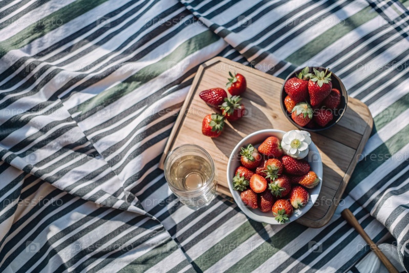 Летний пикник.Вкусные свежие клубники в стильной тарелке на постельном одеяле в парке.Вид сверху, есть место для копирования