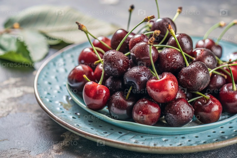 Сладкие ягоды и фрукты ярко-красного и желтого цвета с каплями воды. Вегетарианство. Здоровое питание. Свежие плоды на столе