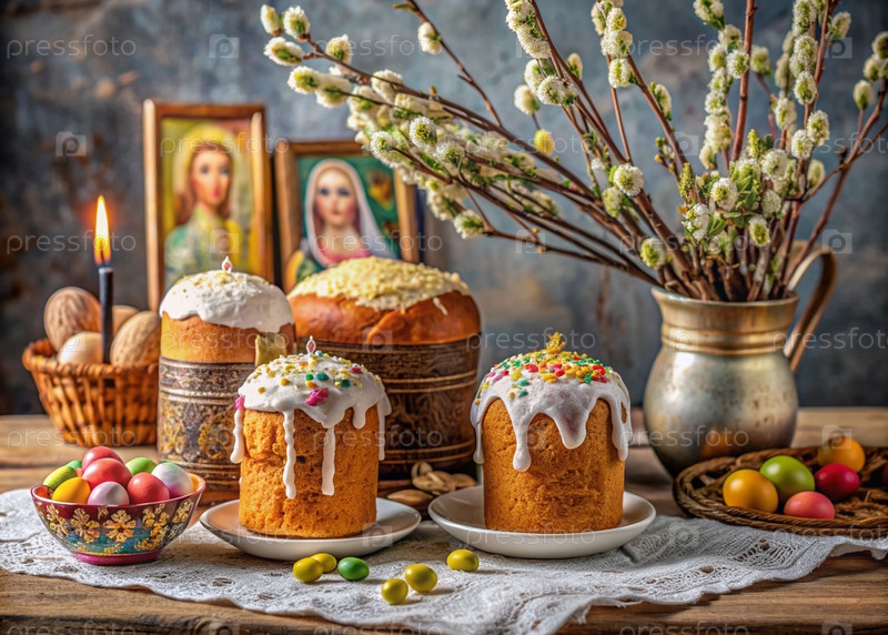 Православный Пасхальный торт, окрашенные яйца, иконы, лица святых, цветы, церковные свечи и пасхальное украшение на деревянном столе в старом деревенском доме
