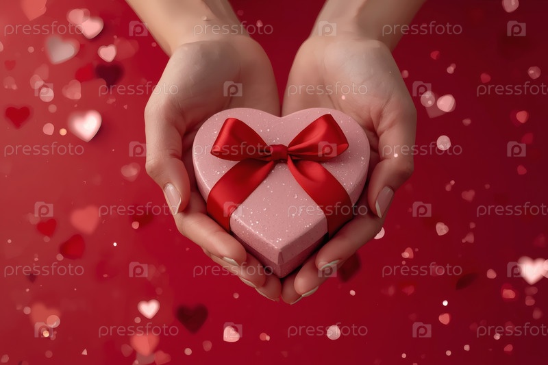 Руки женщины, держащей подарок в форме сердца с красной лукой на День святого Валентина