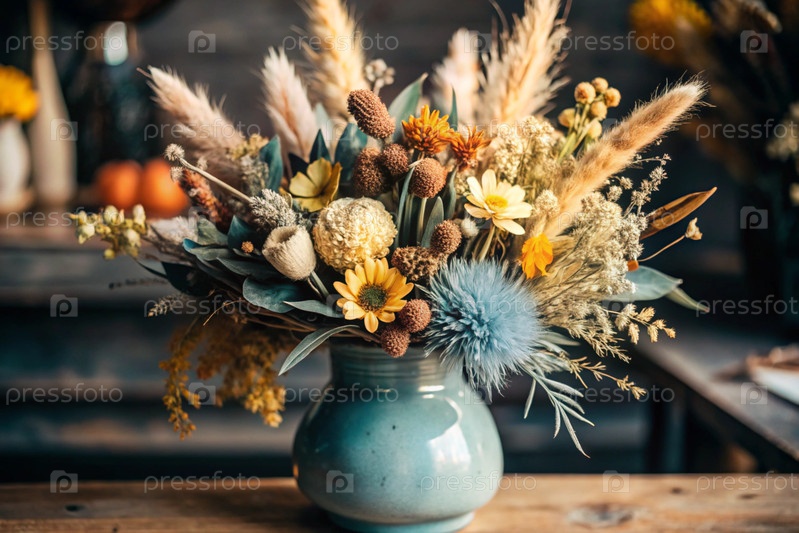 Красивый букет сушеных цветов в керамической вазе на древнем деревянном шкафу. Букет цветов в вазе во внутренней части дома. Светлый, бежевый, синий цветочный фон