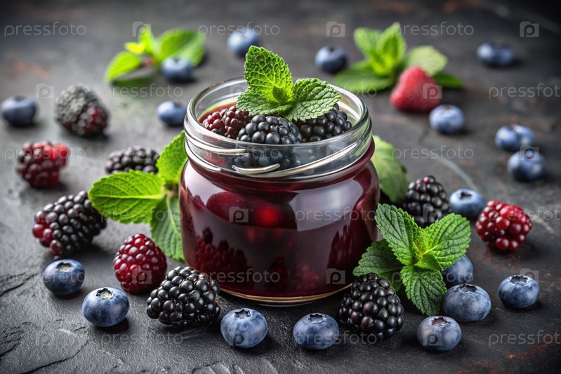 Банка домашней черники, здоровый варенье с мятой на чёрном фоне.Сохранение и уборка летом
