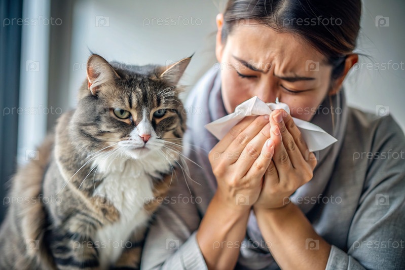 Женщина чихает в белую салфетку дома. Аллергия на волосы кошек и домашних животных. Рядом со мной кот