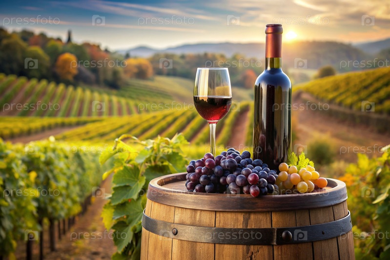 Бутылка красного вина и куча спелых виноград на деревянной дубовой бочке на фоне виноградника