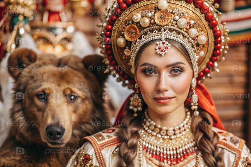 Красивая девушка в традиционном русском национальном костюме.Перед живым медведем.Портрет символизирует традиции и красоту русского народа