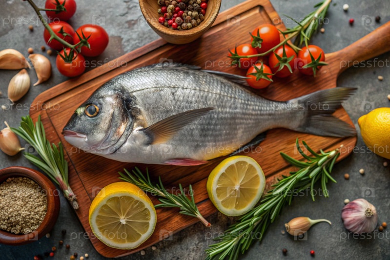 Вкусная и здоровая рыба. сырой дорадо с лимоном и ингредиентами на темном фоне. баннер, меню, место для текста рецепта, верхний вид
