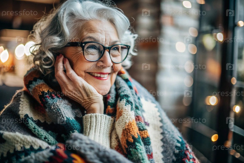 Осенний портрет красивой пожилой женщины, пенсионерки 70 лет. Он завернут в теплую клетку с этническим рисунком. Концепция жизни пожилых людей