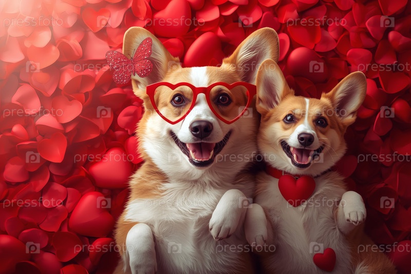 Красивый баннер на День святого Валентина с влюблёнными собаками и красным сердцем. Вид сверху. Романтическая и любящая атмосфера