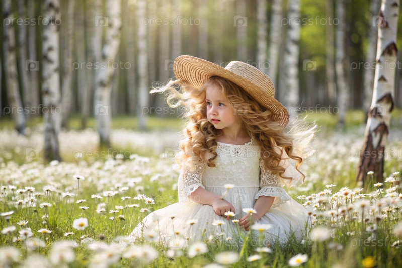 Всероссийский день семьи, любви и верности Красивая маленькая кудрявая девочка в соломенной шляпе с букетом ромашки на фоне поля. День святого Валентина Петра и Февронии