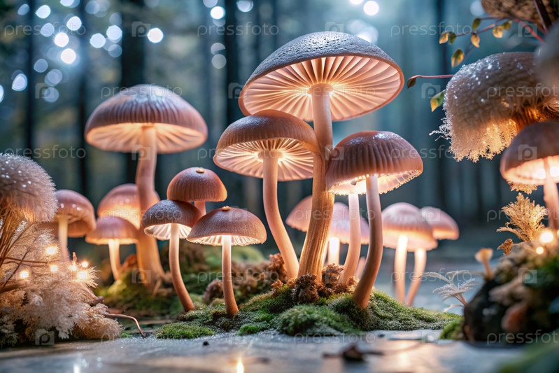 Ядовитые грибы. Жабы. Галлюциногенные грибы. Светящиеся грибы. Изображение для иллюстрации тем, связанных с природой, фантазией, сказками и магией
