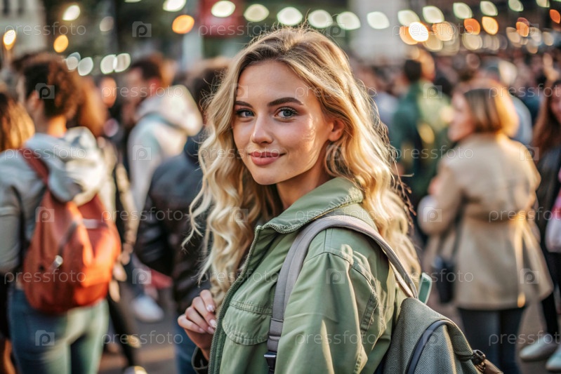 Портрет счастливого красивого путешественника с рюкзаком в городе против прекрасного боке. Путешествие в одиночку, образ жизни. Молодой турист наслаждается отдыхом