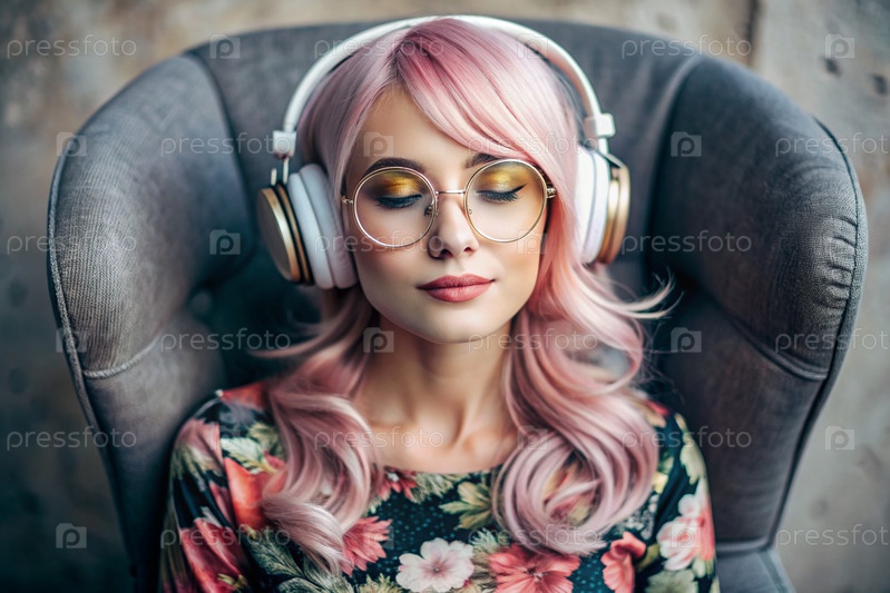 Молодая красивая девушка с розовыми волосами слушает музыку в больших беспроводных наушниках дома, на стуле в гостиной