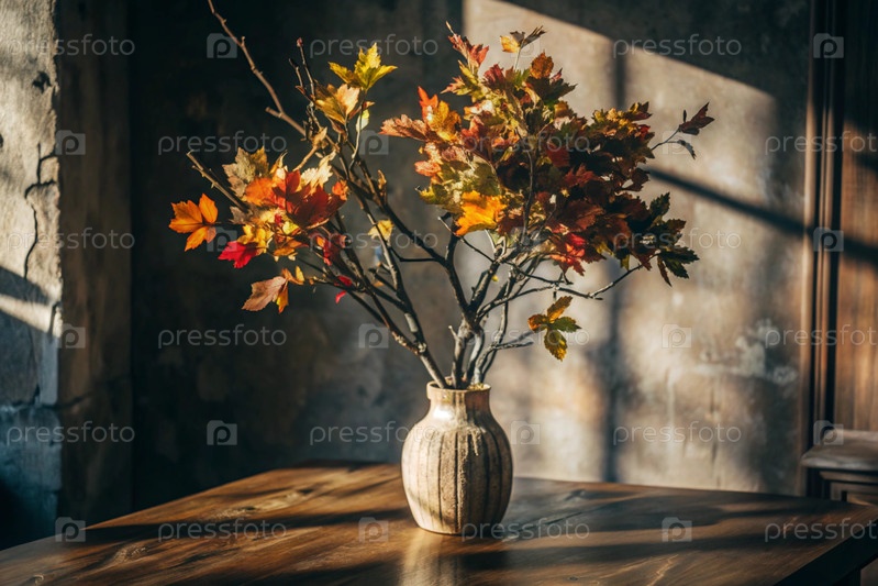 Ветви с золотыми осенними листьями в керамической вазе на деревянном столе у окна. Концепция домашнего комфорта. Осенний декор для Хэллоуина