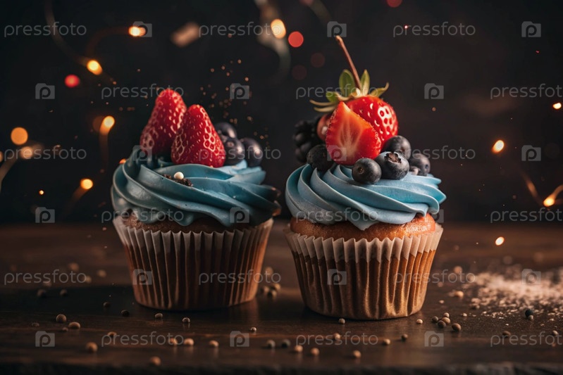 Вкусные красочные кексы со земляницами и чернилами. праздничный кекс, который идеально подходит для веселых торжеств. счастливого дня рождения