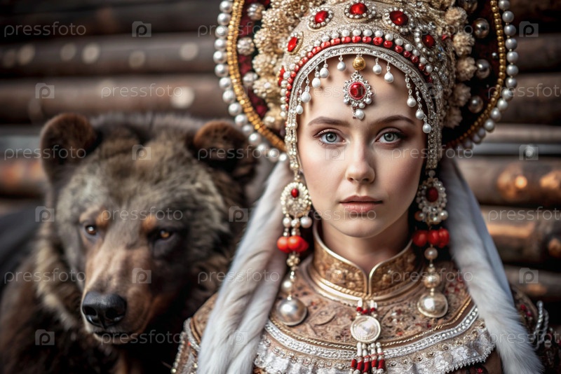 Красивая девушка в традиционном русском национальном костюме.Перед живым медведем.Портрет символизирует традиции и красоту русского народа