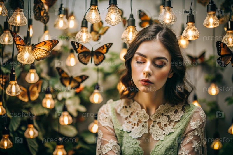 Портрет красивой девушки в зеленом платье среди многих подвешенных лампочек и бабочек, размахивающих вокруг нее