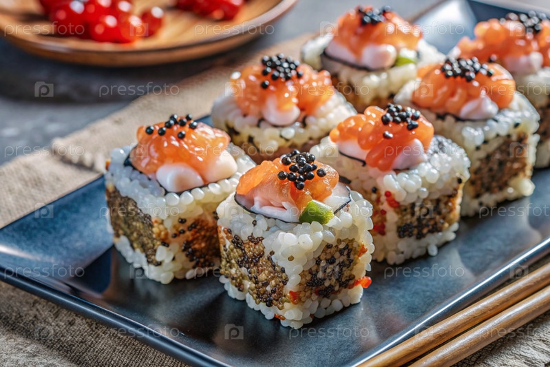 Японская еда. Суши-роллы Калифорния, Филадельфия с угорьем, красной икры и лососем. Концепция меню суши-бара